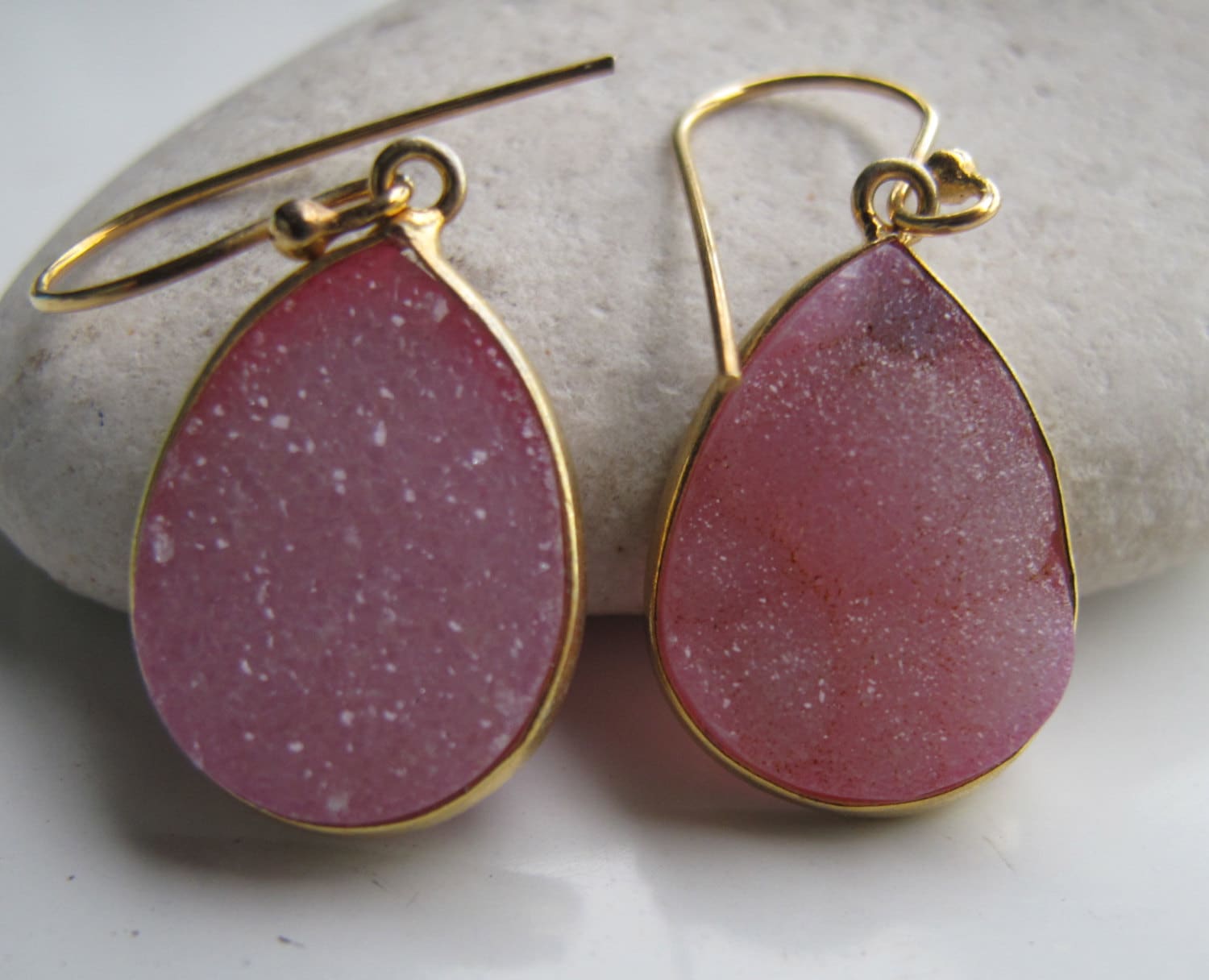 A Gorgeous pair of 18k Gold Vermeil Dangle Earrings in pear shaped Pink Druzy which make a great statement earring. Vermeil is 18k gold plated over sterling silver. Wrapped in a box ready for gift giving.