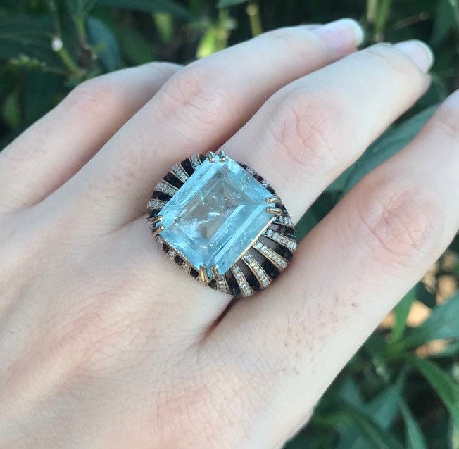 9ct Aquamarine Diamond Rectangle Solitaire Ring- Aquamarine Emerald Cut Gold Ring- Avant Garde Large Statement OOAK Ring