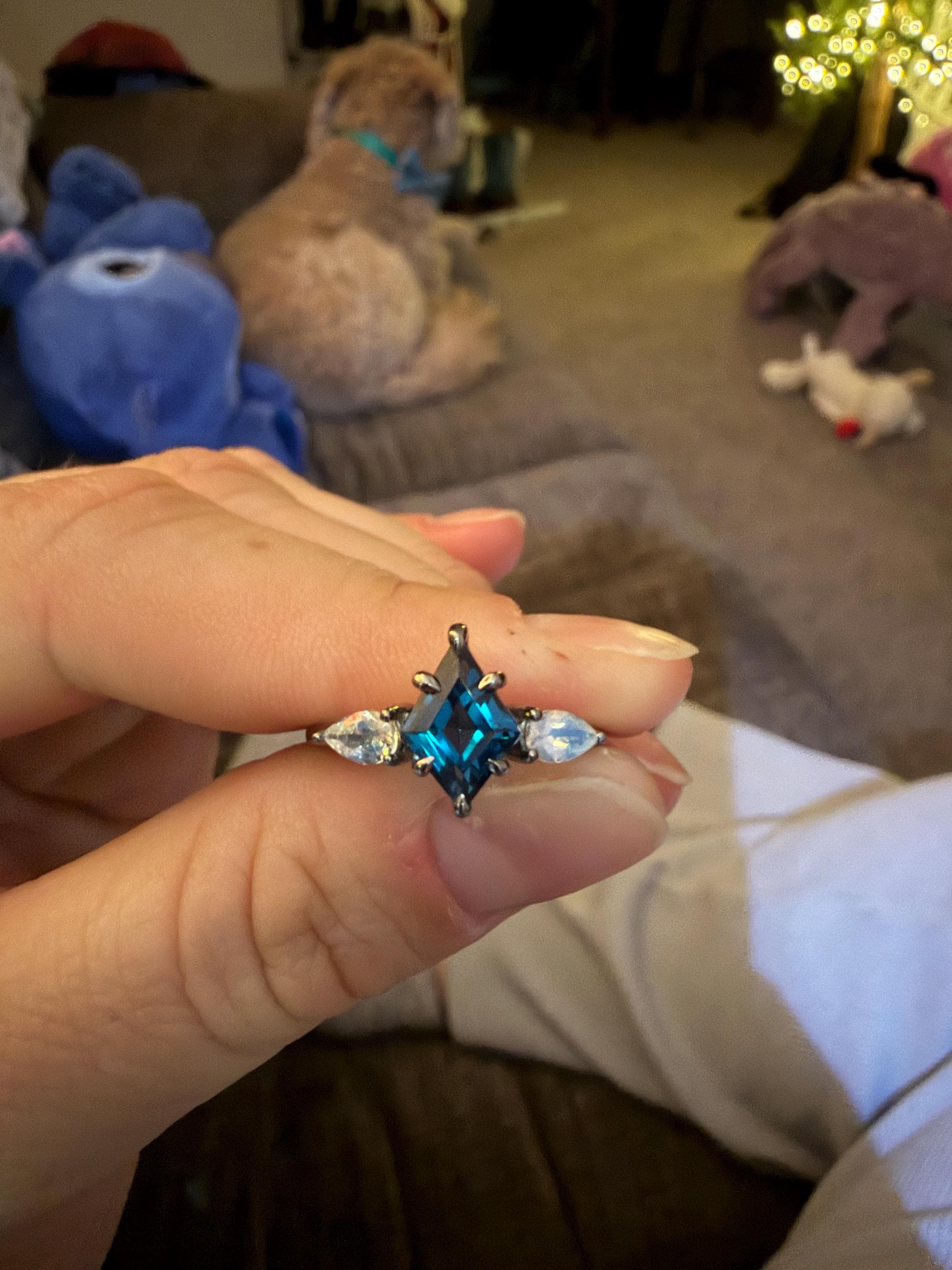 A Kite Shaped London Blue Topaz is set in a 6 prong setting flanked with Teardrop Genuine Iridescent Moonstone, paired with a Contour Wedding Band embellished with Marquise and Teardrop Genuine Iridescent Moonstone accented with moissanite handcrafted in High Quality 925 Sterling Silver, Rose or Gold or Black Plated. Our Engagement Ring Set will have her swooned as it is a very unique ring set. It comes with a Ring Box ready for gift-giving.