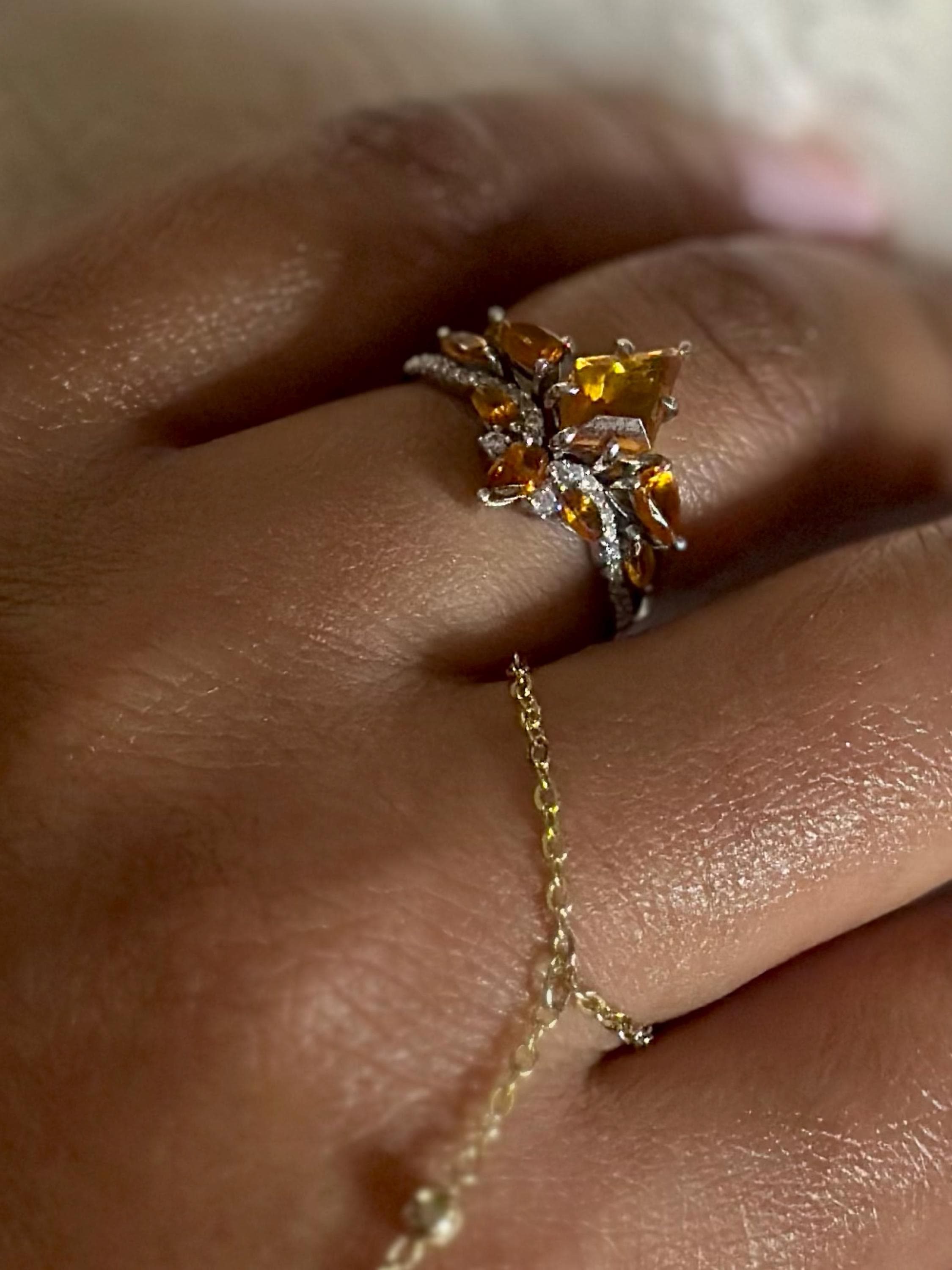 A Kite Shaped Orange Yellow Citrine is set in a 6 prong setting flanked with Teardrop Citrine, paired with a Contour Wedding Band embellished with Marquise and Teardrop Citrine accented with cubic zirconia handcrafted in High Quality 925 Sterling Silver, Rose or Gold or Black Plated. Our Engagement Ring Set will have her swooned as it is a very unique ring set. It comes with a Ring Box ready for gift-giving.